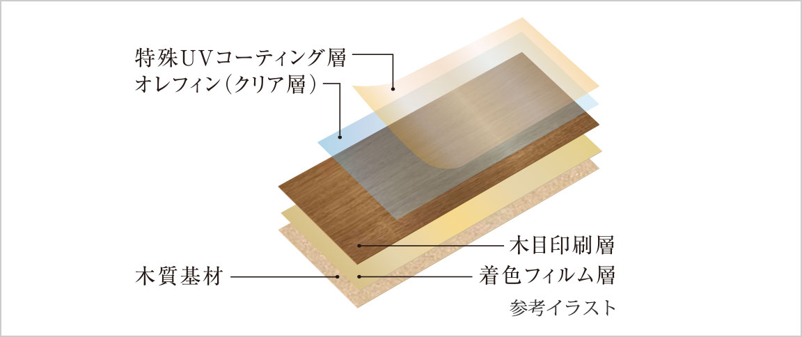 特殊UVコーティング層により日焼けや退色しにくく水、アンモニアにも強いため美しい状態を長く保ちます。お部屋が広々と感じられる幅広タイプのフローリングです。