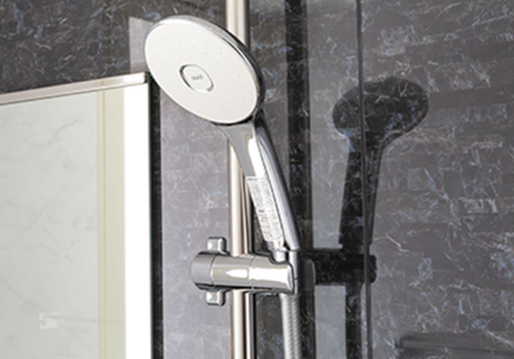 メタル調の輝きが高級感を醸す、デザイン性に優れたシャワーヘッドを採用。お好みの高さに調節できるスライドバーも設置しています。