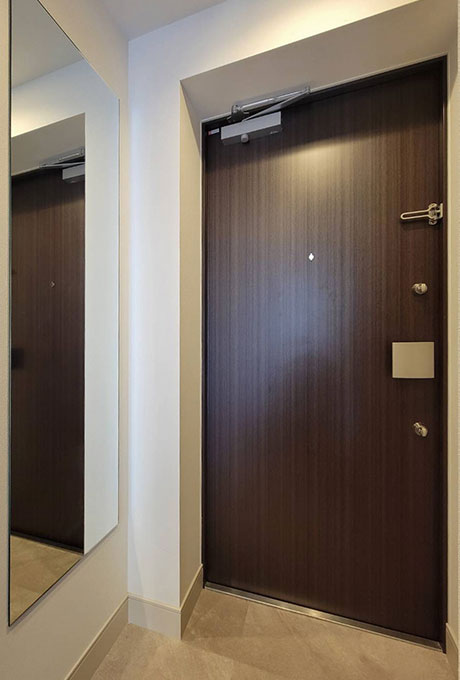 玄関にお出かけ前の身だしなみを確認できる姿見ミラーを設置しています。