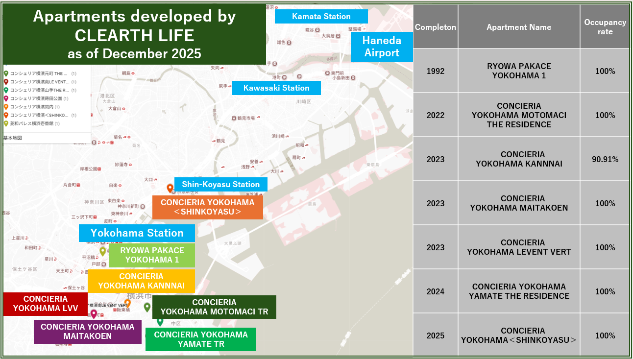 The occupancy rate of units managed by CLEARTH RENT in Yokohama City remains high, at 98.40% as of December 31, 2025.* In particular, the ”CONCIERIA" series has a strong track record of stable occupancy.