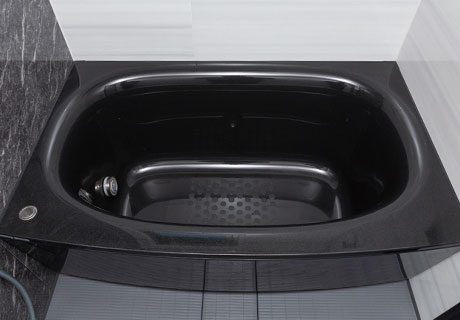 FRPの2倍の硬度を持ち、滑らかな表面で汚れをはじく「有機ガラス系新素材」。水や汚れを防ぐ「はっ水・はつ油成分」が素材に練りこまれており、キレイが長続きします。全身を包み込むような丸みを帯びた曲線が特徴的な弓型形状の浴槽です。