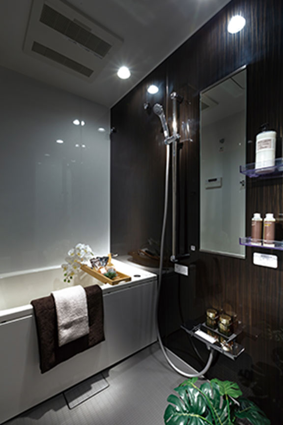 メタル調の輝きが高級感を醸す、デザイン性に優れたシャワーヘッドを採用。お好みの高さに調節できるスライドバーも設置しています。