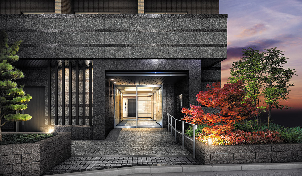御影石貼りの門構えが重厚感溢れるアプローチ。