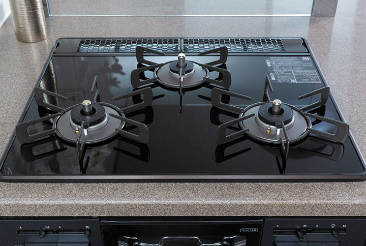 自動炊飯機能、焦げつき消火機能など、便利機能と安全機能を豊富に装備したガスコンロ。水無し両面焼きグリル付きなので魚などの焼き物も楽々。耐熱セラミックガラスのトッププレートでお手入れも簡単です。