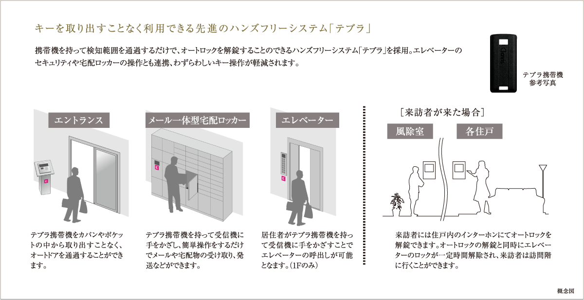 テブラ携帯機を持って受信機に近づき簡単操作をするだけでメールや宅配物の受け取り操作が可能なメールボックス一体型宅配ロッカーを採用。配達の際、業者と直接顔を合わせることなく荷物の受け渡しができる為防犯にも有効です。また、メールボックスは扉が自動的に開く電気錠タイプなのでダイヤル錠を合わせる手間や、暗証番号を覚える面倒もありません。