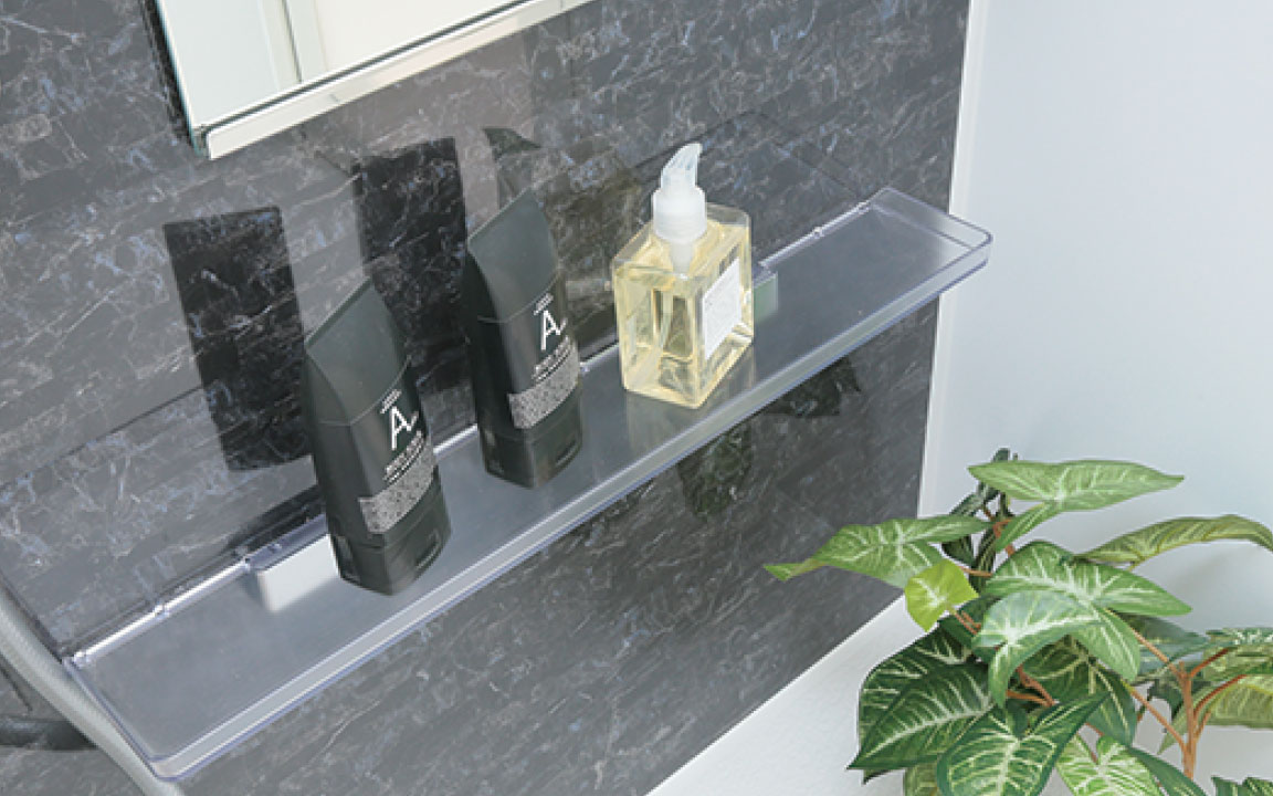 シャンプーなどの小物を置く際に便利な収納棚は、空間に調和するシンプルデザイン。取り外して洗えるので清潔感を保てます。