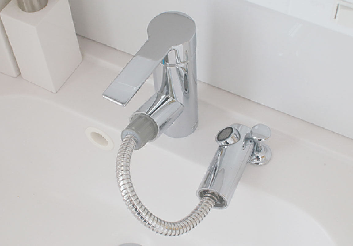 ホース引出し式の水栓を採用。隅々まで水が届くため洗面ボウルのお手入れも簡単です。
