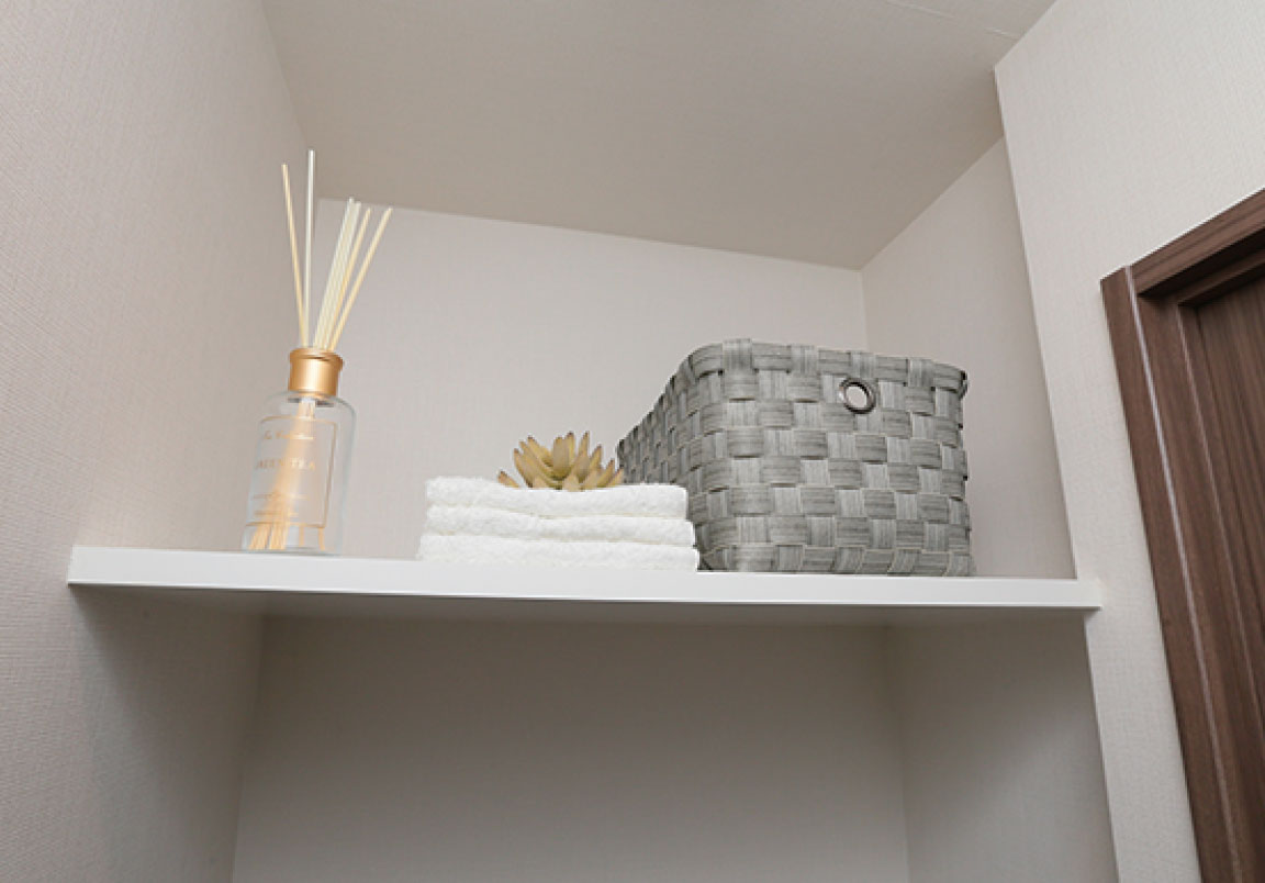 トイレットペーパーや掃除用具などの置場として棚を設置しています。