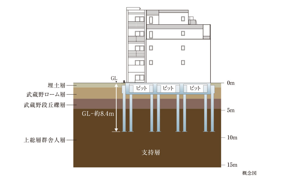 地震に強い建物づくりには、強固な地層を支持地盤とすることが重要です。本物件では、N値5 0以上の支持層を建物を支える支持地盤としています。また、基礎形式を独立基礎、その下に羽根付鋼管杭5 9本を打ち込んでいます。