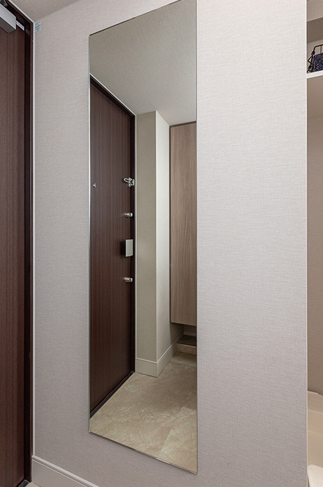 玄関にお出かけ前の身だしなみを確認できる姿見ミラーを設置しています。