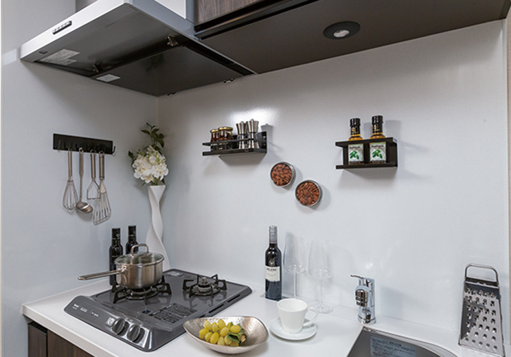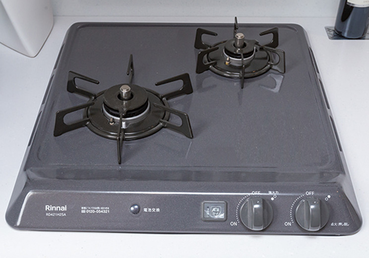 2口ガスコンロを採用しています。温度センサーを搭載しており一定の温度になると自動消火するので安心です。