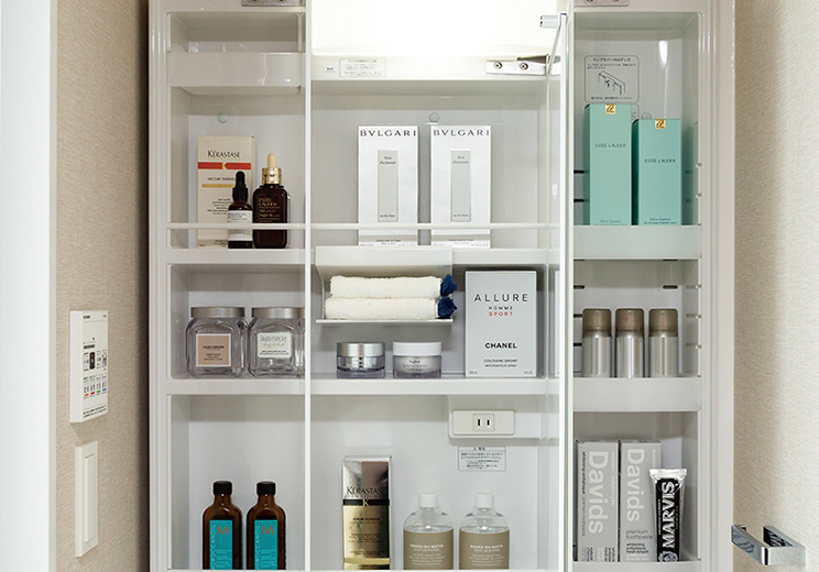 鏡の裏側に収納スペースを確保。スキンケア・ヘアケア用品などをスッキリ整理出来ます。また、収納棚にはコンセントを設置。ドライヤーや機器の充電時など、便利にお使いいただけます。