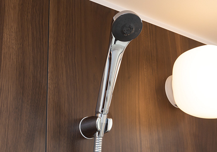 なめらかなメタル調の輝きが高級感を醸し出す、機能性とデザイン性に優れたシャワーヘッドを採用。