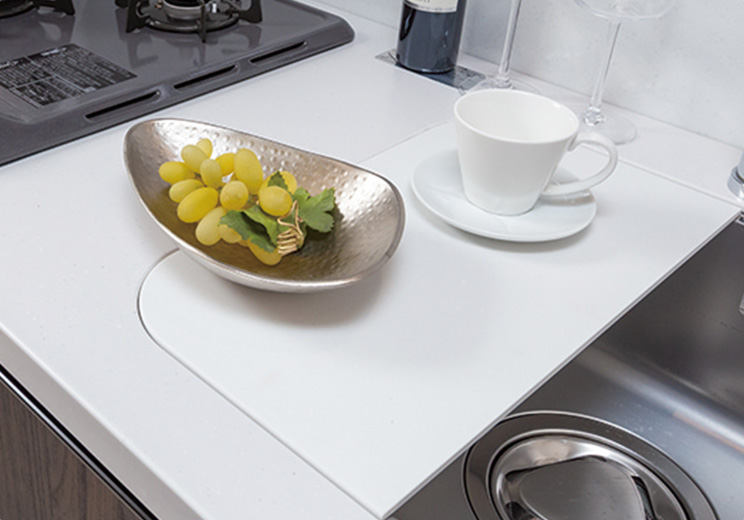 キッチン天板と同じ人造大理石のスライドプレート付き。作業に合わせてカウンタートップを自在に使うことができます。