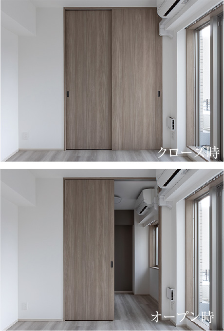 3枚の引戸が全て引き込めるためオープン時には広々とした空間に。住まい方に合わせて自在にお使いいただけます。