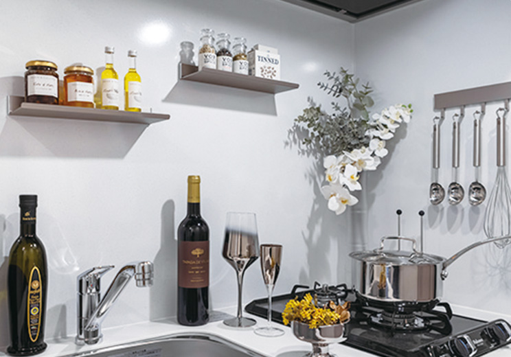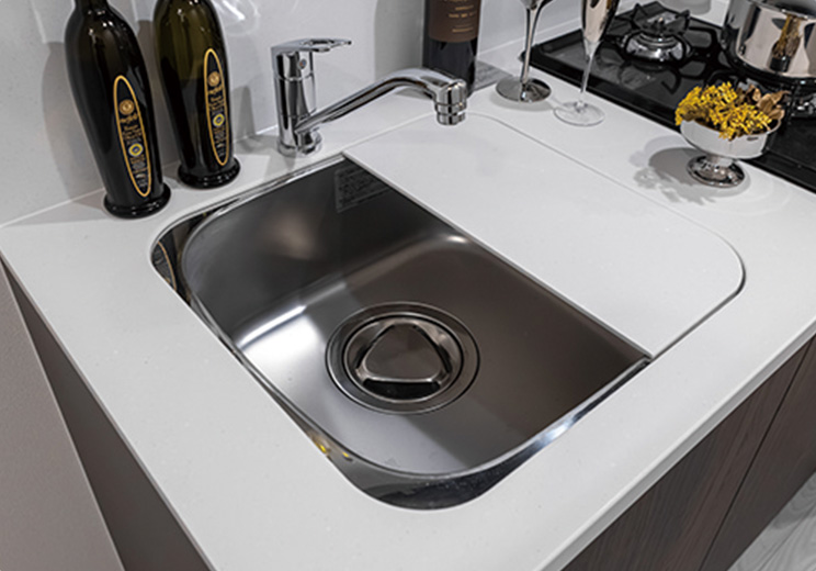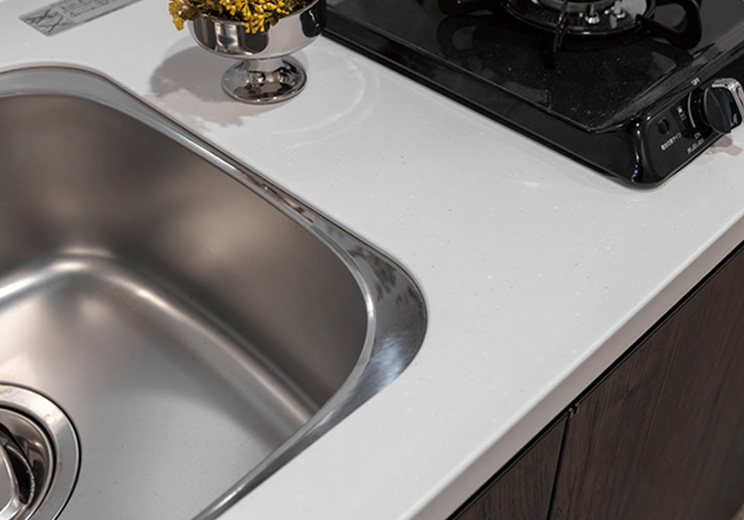 傷がつきにくくお手入れの楽な人造大理石のカウンタートップを採用。美しいキッチンを演出します。