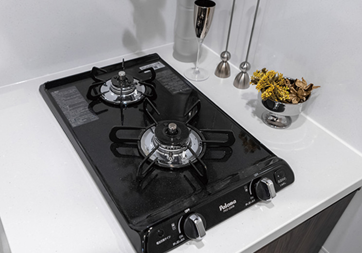 2口ガスコンロを採用しています。全口に立ち消え安全装置を搭載しており、煮こぼれやふきこぼれ等で火が消えた時に自動でガスを止めるので安心です。