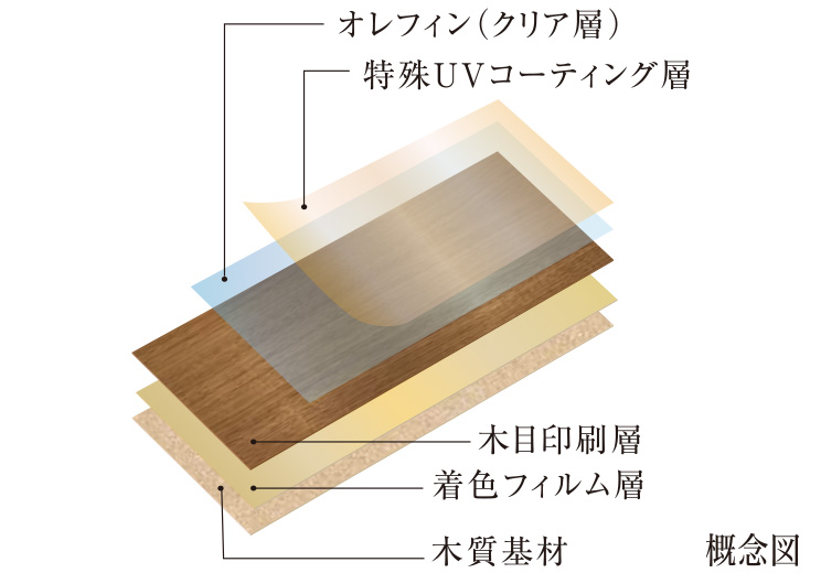 特殊UVコーティング層により日焼けや退色しにくく、耐摩耗、耐汚染性能にも優れており、美しい状態を長く保ちます。お部屋が広々と感じられる幅広タイプのフローリングです。