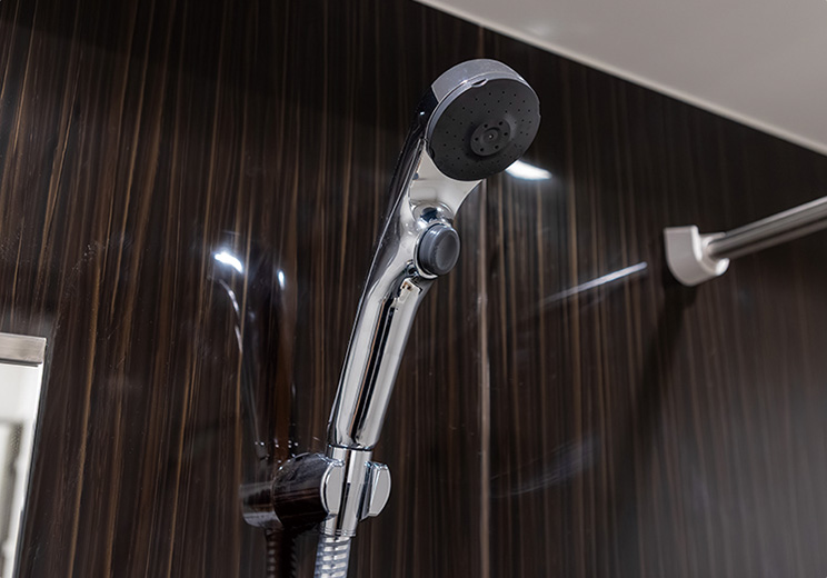使い勝手のよいサーモシャワー水栓。シャワーヘッドは手元でこまめにオン/オフの切替ができます。