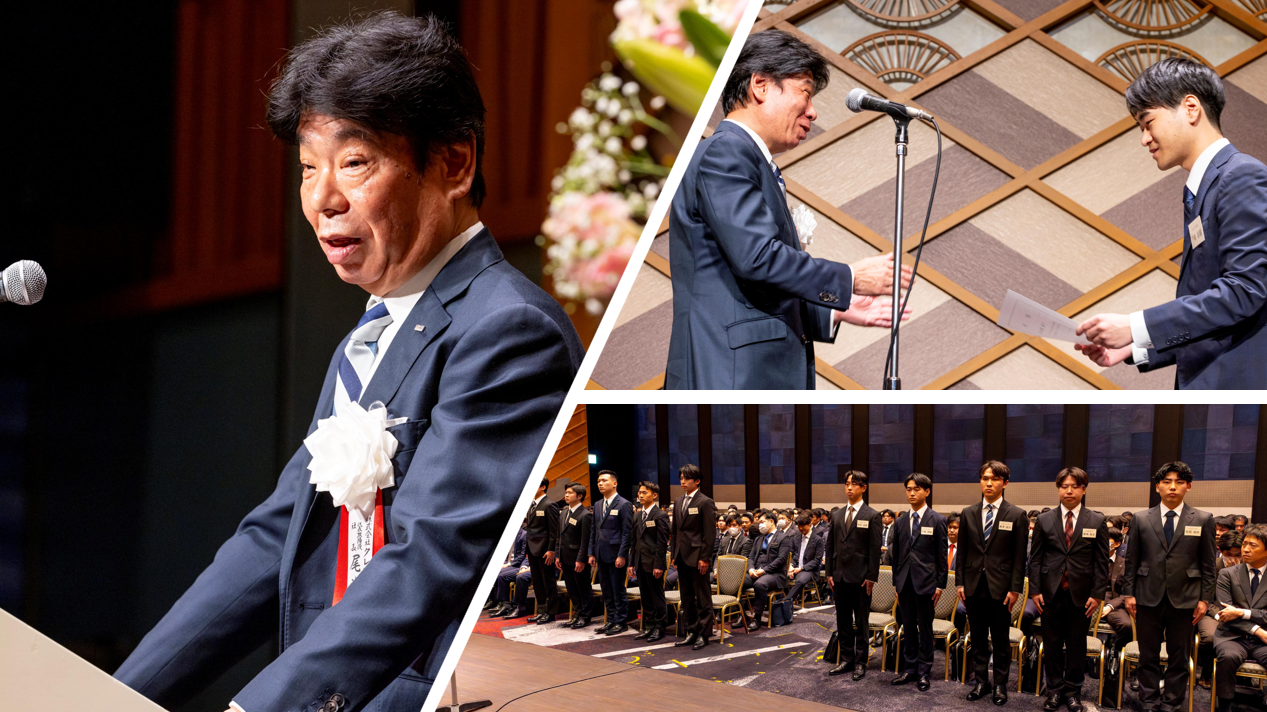 由代表取締役尾池社長給予新進同仁嘉勉與鼓勵。新進員工一人一人,臉上都流露出各自的決心與些許緊張,以及對即將展開的社會生活所懷抱的期待。