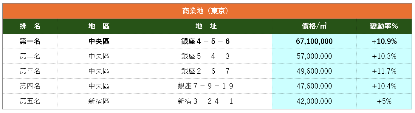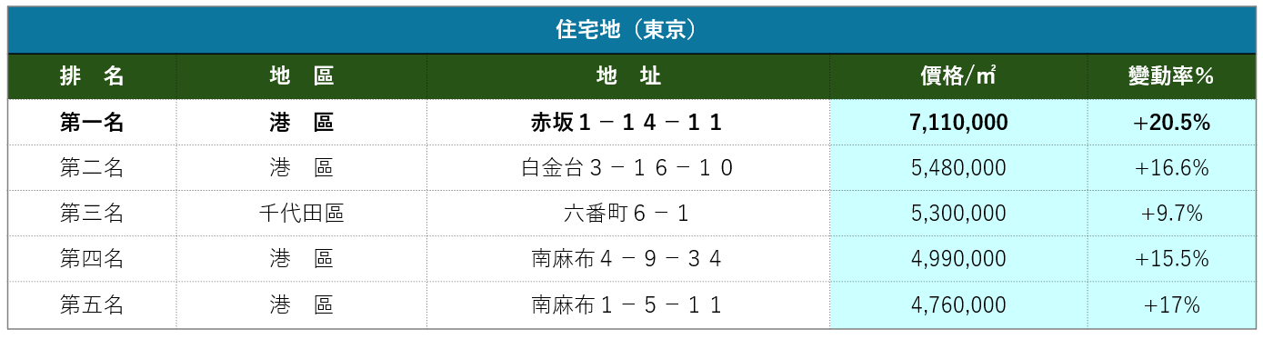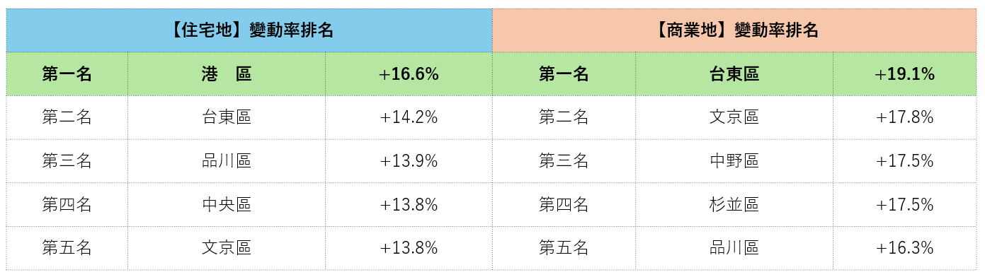 特別是在都心具高便利性的區域(如港區港南、赤坂、芝浦及文京區本鄉等),地價皆呈現高幅度上升。由於都心供給有限,土地稀缺性提高,使漲幅進一步擴大。富裕族群的需求亦維持穩健,市場行情依然強勢。