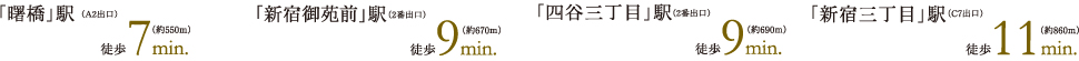 「四谷三丁目」駅徒歩9分、都営新宿線・東京メトロ丸ノ内線・東京メトロ副都心線「新宿三丁目」駅から徒歩11分の4駅3路線が利用可能。