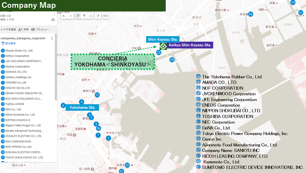 JR Shin-Koyasu Station and Keikyu Shin-Koyasu Station are major stations in Kanagawa Ward, Yokohama City, which is home to a population of approximately 240,000 people. To the south of the stations, there are open views of Yokohama Port, including the Minato Mirai 21 district, and the surrounding area has developed as a manufacturing hub for science, machinery, and other industries. Furthermore, based on the “Keihin Waterfront Area Reorganization and Development Master Plan” formulated by Yokohama City, efforts are currently underway to create industrial spaces that will drive technological innovation, as well as new urban spaces rich in tourist attractions.